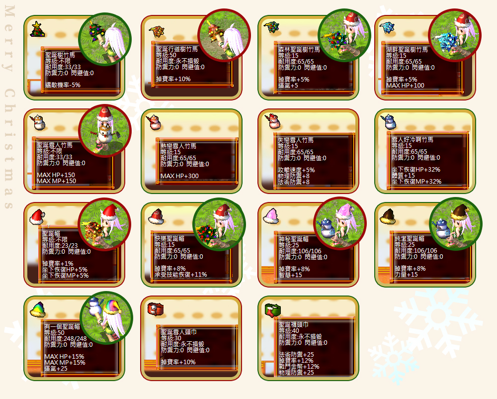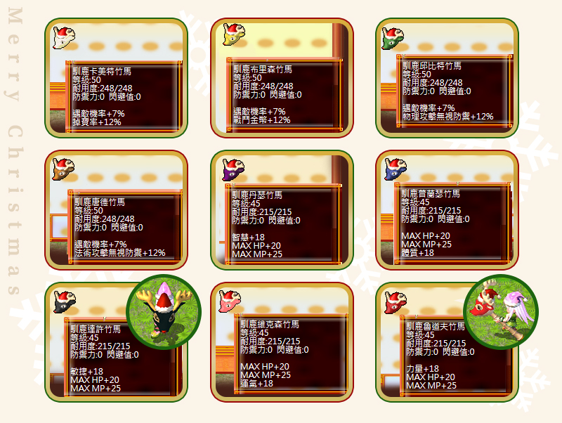 - 隨機內容:聖誕雪人頭巾、森林聖誕樹竹馬、湖畔聖誕樹竹馬、聖誕雪人竹馬、純潔聖誕帽、神秘聖誕帽