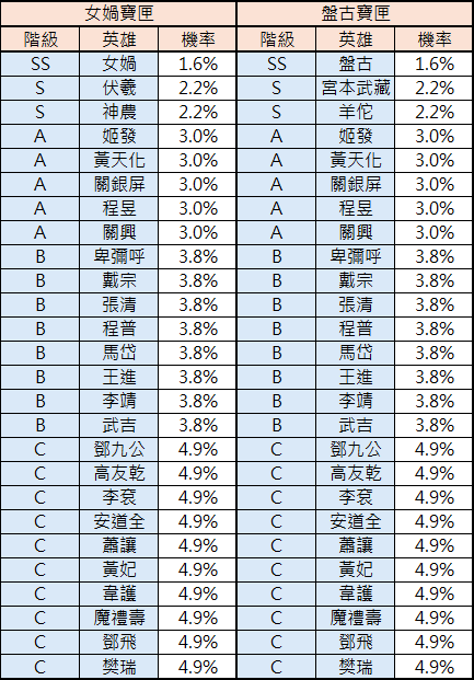 - 星圖效果更新英雄:女媧、盤古、伏羲、神農、宮本武藏、羊佗、黃天化、關銀屏、關興、程昱、張清、武吉、卑彌呼、李袞